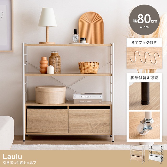商品紹介 機能的で洗練された空間を作る『Laulu(ラウル)』引き出し付きシェルフ 【組立品】 【梱包サイズ】99cm×35.5cm×20.5cm 【梱包重量】約21.4kg 【商品重量】約19.5kg 【耐荷重】棚板(各):約10kg、引出天板:約10kg、引出底板(各):約8kg ※組み立て時間:2人で約60分 商品詳細 サイズ・容量 【アジャスター使用時】幅83.5cm×奥行30cm×高さ90cm 【キャスター使用時】幅83.5cm×奥行30cm×高さ93.5cm 規格 【本体】パーティクルボード(メラミン貼り)、スチール(粉体塗装) スチール(粉体塗装) 商品管理番号:159020 159020-NA 159020-MWH