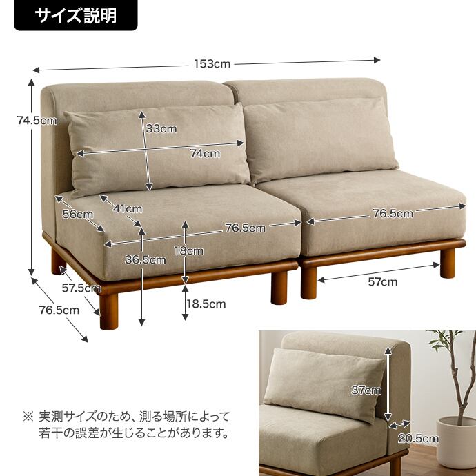 幅153cm(76.5cm+76.5cm)×奥行76.5cm×高さ74.5cm (座面高 36.5cm)
