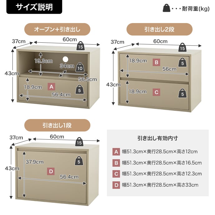 【耐荷重】天板:約15kg 、オープン収納:約10kg、引き出し:約5kg