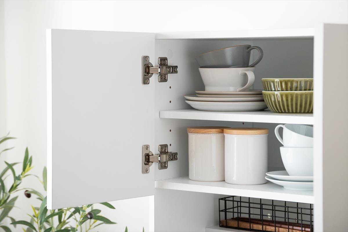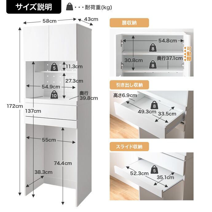 【耐荷重】扉収納可動棚:約8kg、扉収納底板:約8kg、スパイスラック:約5kg、上段スライドトレー:約10kg、引き出し収納:約8kg、下段スライドトレー:約5kg