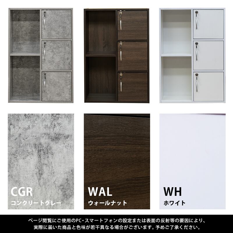 ウォールナット(WAL)、ホワイト(WH)、コンクリートグレー(CGR)の3色展開です