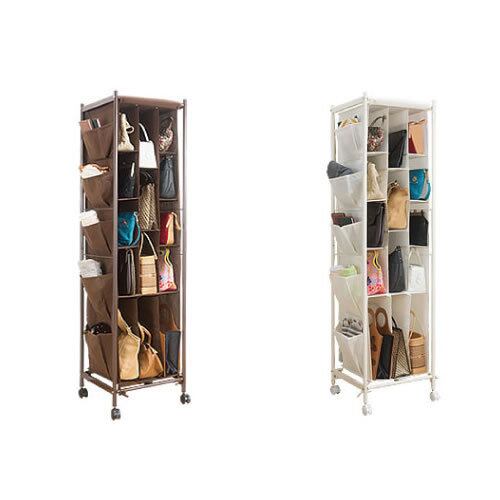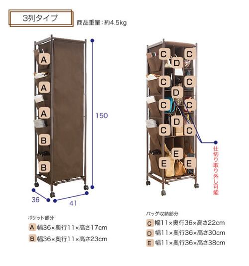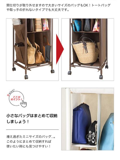 ●増えてしまう小さめのバッグをきれいにまとめて収納。サイドのポケットには小物などをしまうのに便利です。