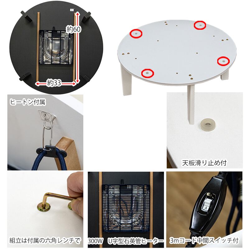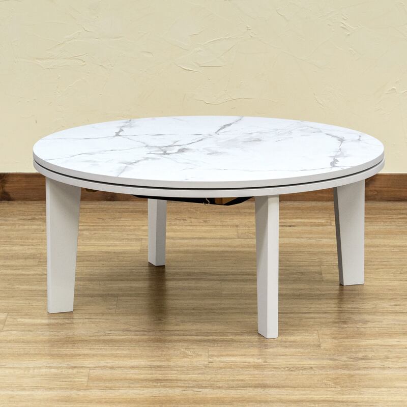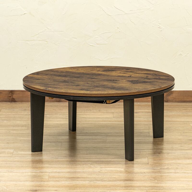 重厚なヴィンテージテイストの木目調天板が特徴の丸型コタツです。